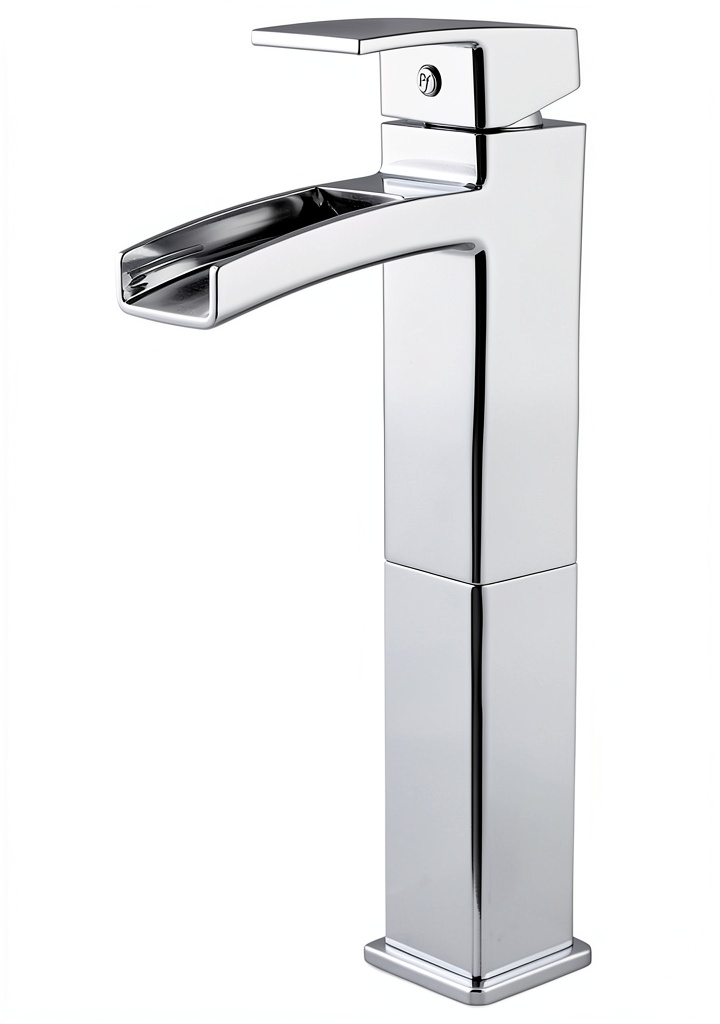 The Pfister LG40DF0C Kenzo single control vessel bathroom faucet in polished chrome is designed for both style and durability. Crafted from high-quality metal alloy, likely brass or stainless steel, it features a sleek chrome finish that resists tarnishing. The faucet includes a 1.2 gallons per minute flow rate, disc valve technology, and a waterfall spout with a 4.53-inch reach. It comes as a 5-piece set with components like the base plate, faucet, long nut, metal washer, and putty plate, ensuring easy installation. Weighing 4.9 pounds, this deck or tabletop mount faucet is built for long-term use in residential bathrooms.